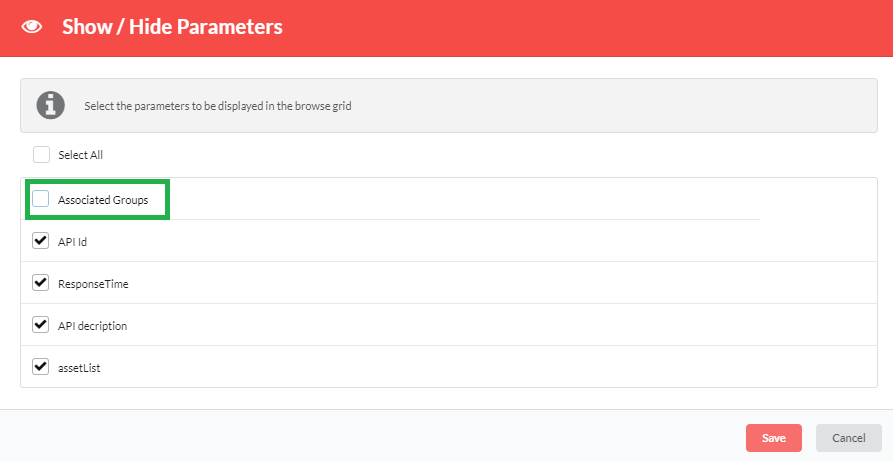 - In the Show/Hide parameters dialog, deselect the Associated Groups check box and click Save, to hide the Manage Access column on the Browse <Asset> Instances screen.