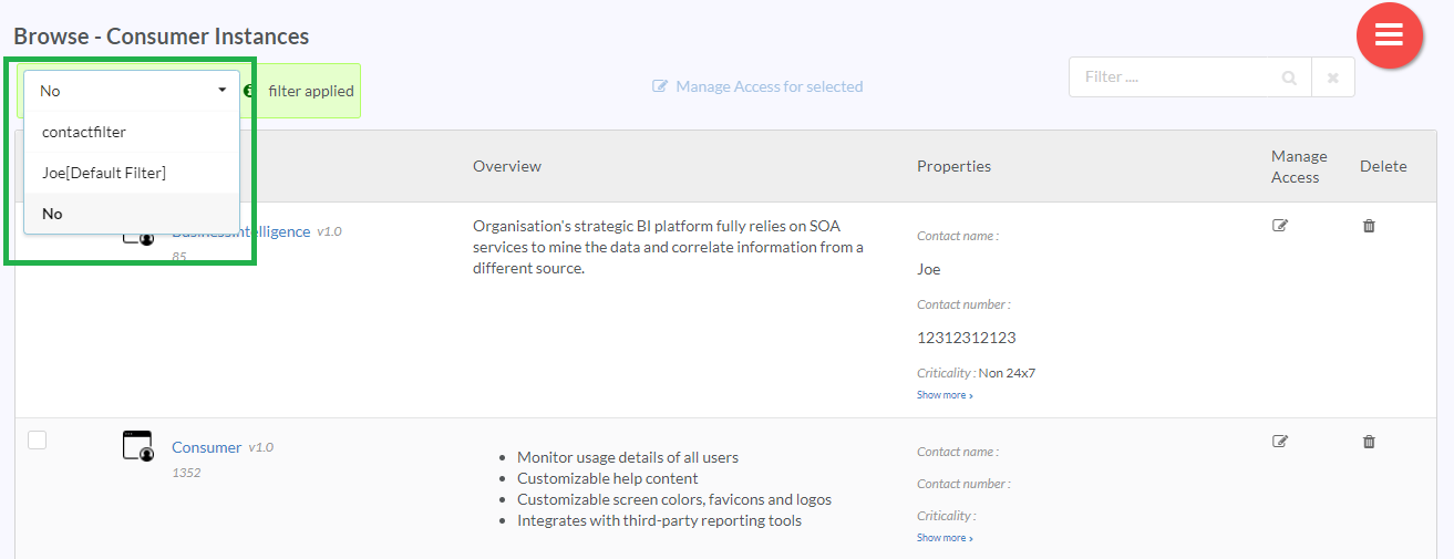 You can use the general filter option from the Browse - API Instances grid page for a quick narrowing down on the API instance(s) you are looking for. For more information, see: Using the Filter option.