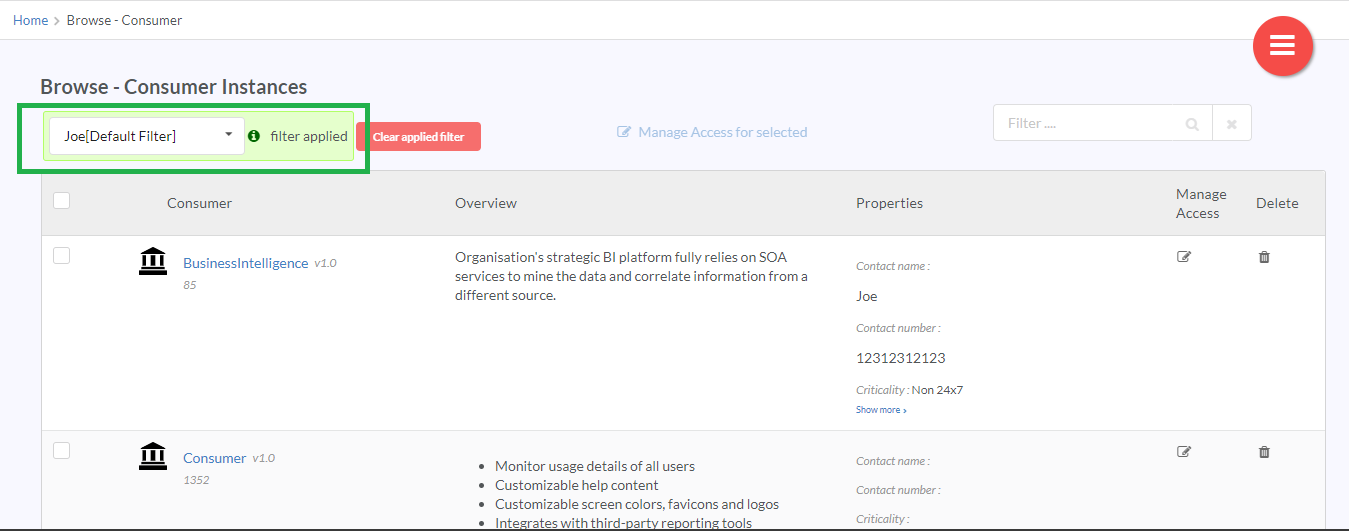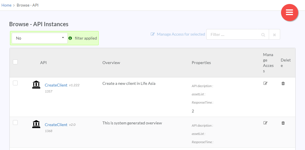 - Click Save to redirect to the Browse <Asset> Instances screen where the Manage Access column will no longer be visible.