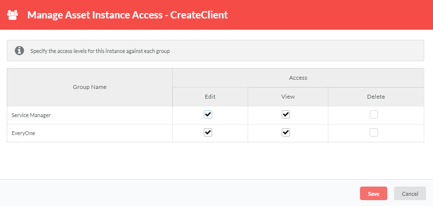 In the Manage Asset Instance Access dialog, click to select/deselect the checkboxes corresponding to the Groups for which you wish to allow/remove Edit/View/Delete access to the Asset Instance.