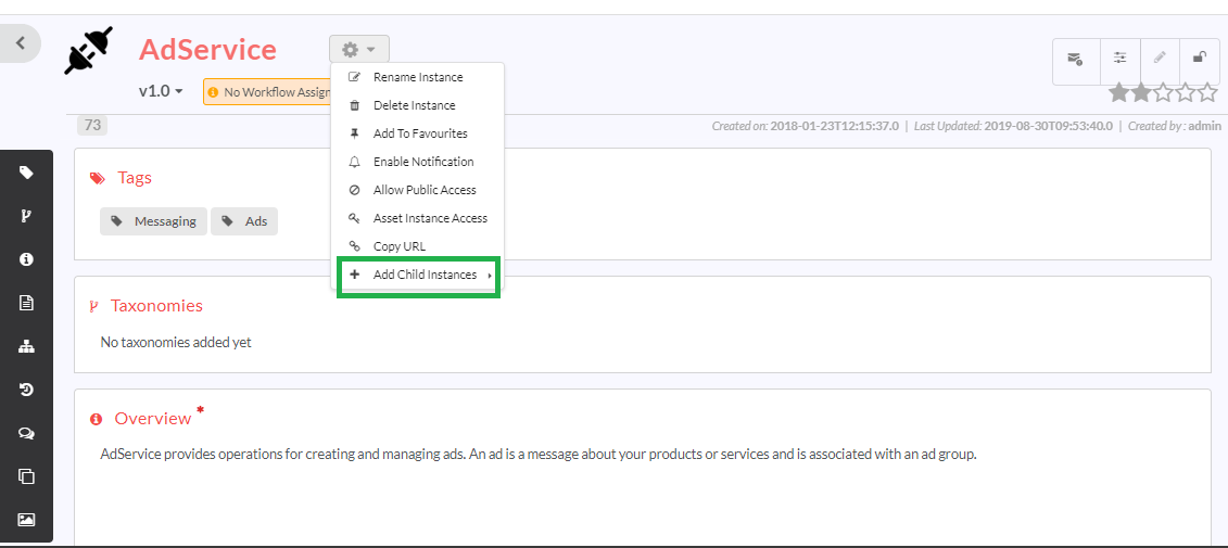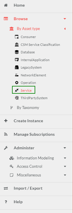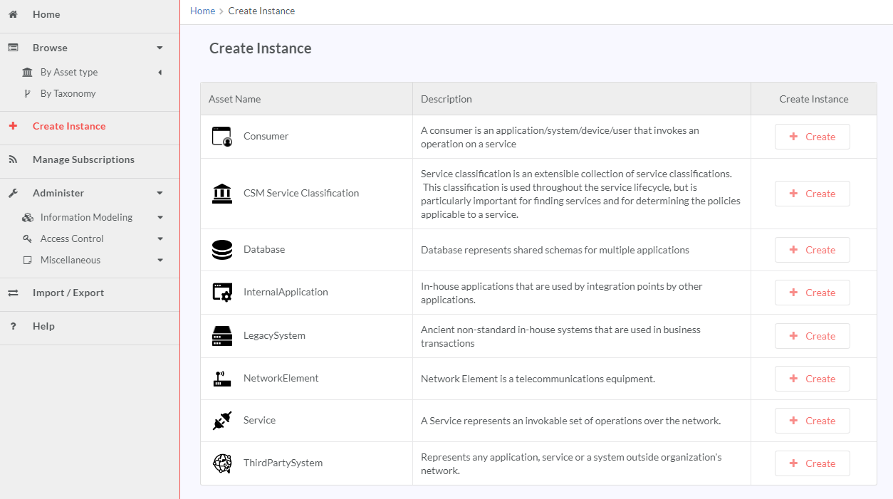 The Create Instance menu option, like the Browse By Asset Type option, allows creation of Instances for Asset Types as per access permission settings.